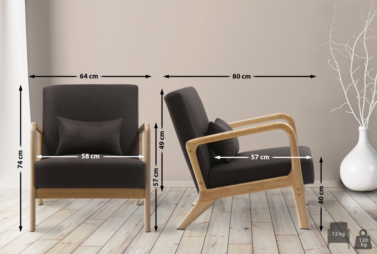 Prostorné křeslo zaujme odolným látkovým potahem v módních barvách a pevnýma nohama ze světlého kaučukovníku.