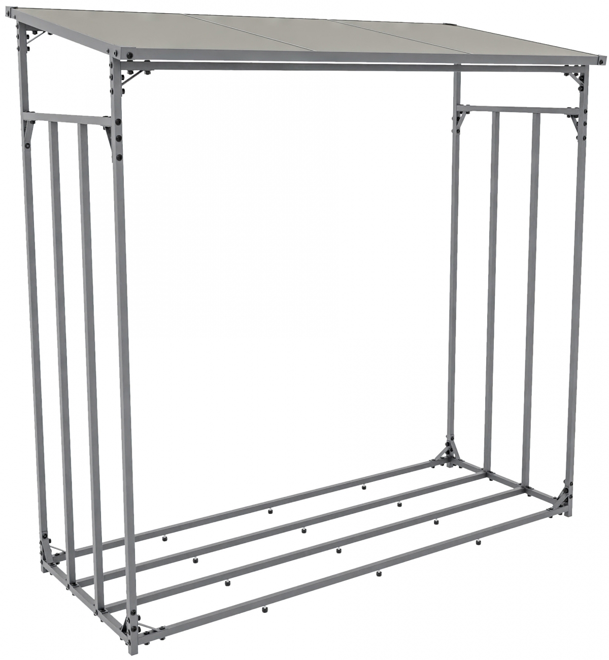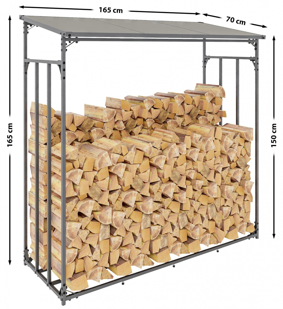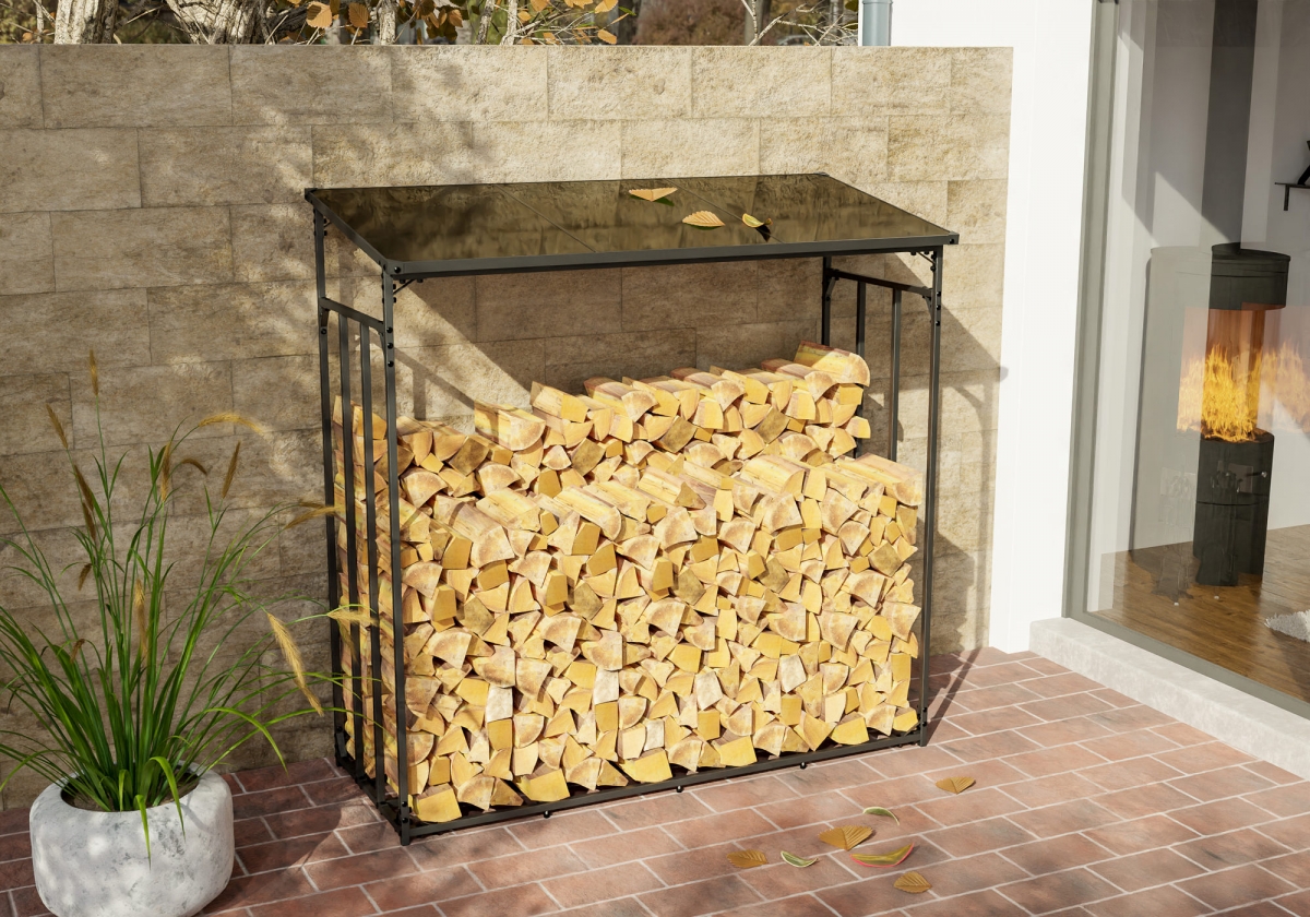 Robustní přístřešek na palivové dříví s ocelovou konstrukcí a polykarbonátovou střechou. Ideální pro bezpečné vnější uskladnění dřeva pro krb, o rozměrech 165 x 165 x 70 cm. Odolný, dekorativní a snadno montovatelný.