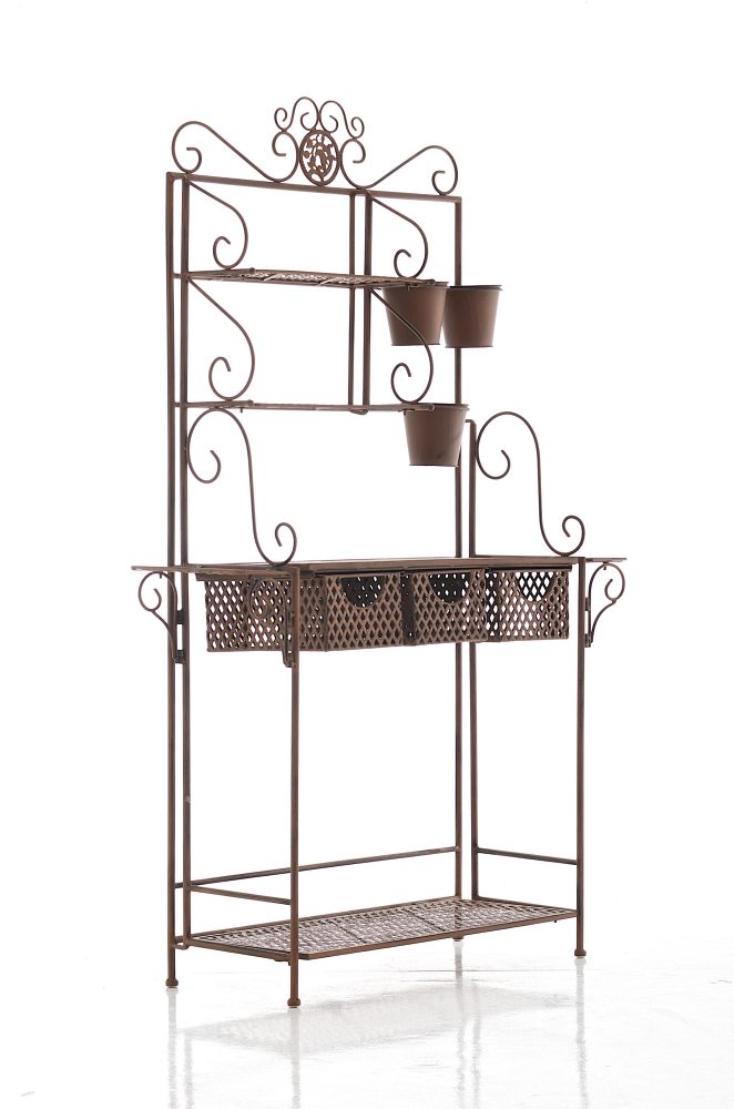 Nabízí mnžstvo prostoru: 4 police a 3 ručně kované kovové koše. Navíc má 3 dekorativní držáky pro 3 kovové květináče. Na obou stranách najdete další odkládací police.
