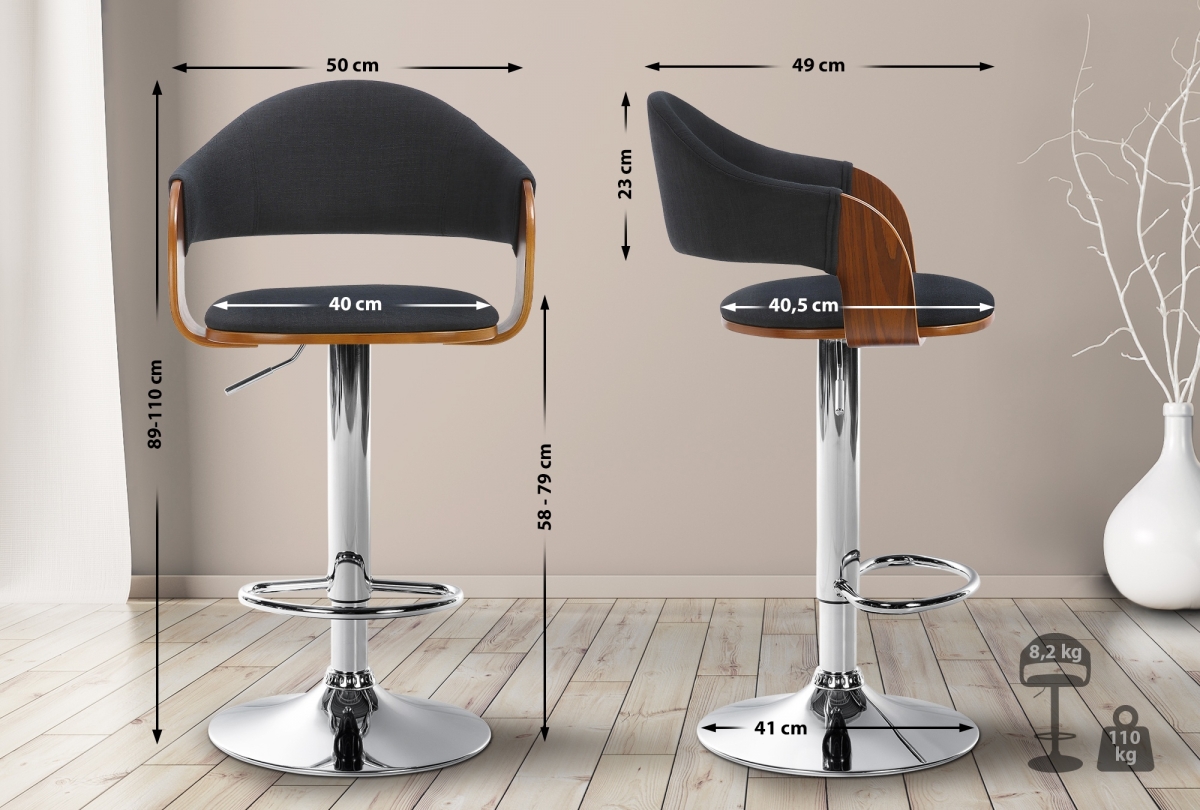 Stylová sada 2 látkových barových židlí Nilse s nastavitelnou výškou a otočným sedadlem. Moderní design, pohodlné čalouněné sedátko a opěrka nohou zaručují maximální komfort i při delším sezení. Ideální do kuchyně nebo domácího baru.