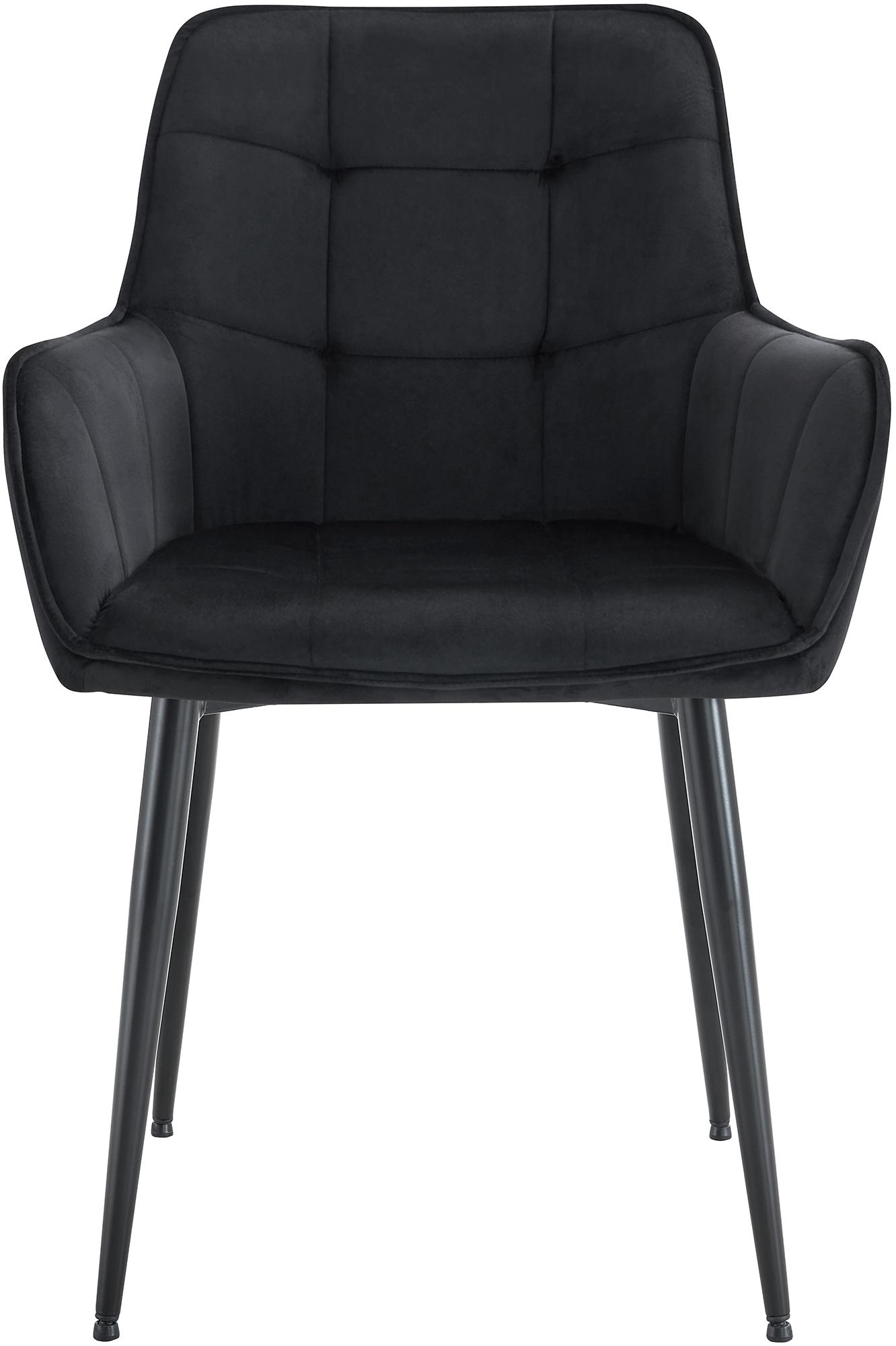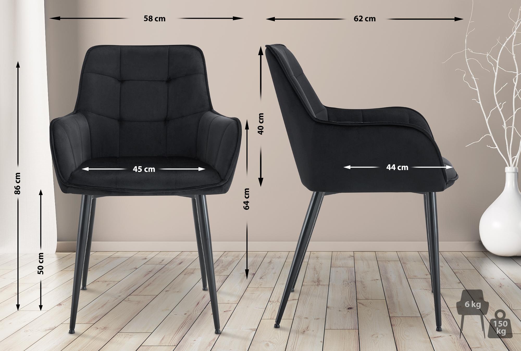 Moderní jídelní židle s pohodlným čalouněným sedátkem a područkami. Sametové čalounění a kovový rám o nosnosti 150 kg zaručují styl a odolnost. Ideální do jídelny, ložnice nebo jako židle pro čtení - ergonomický tvar pro delší sezení.