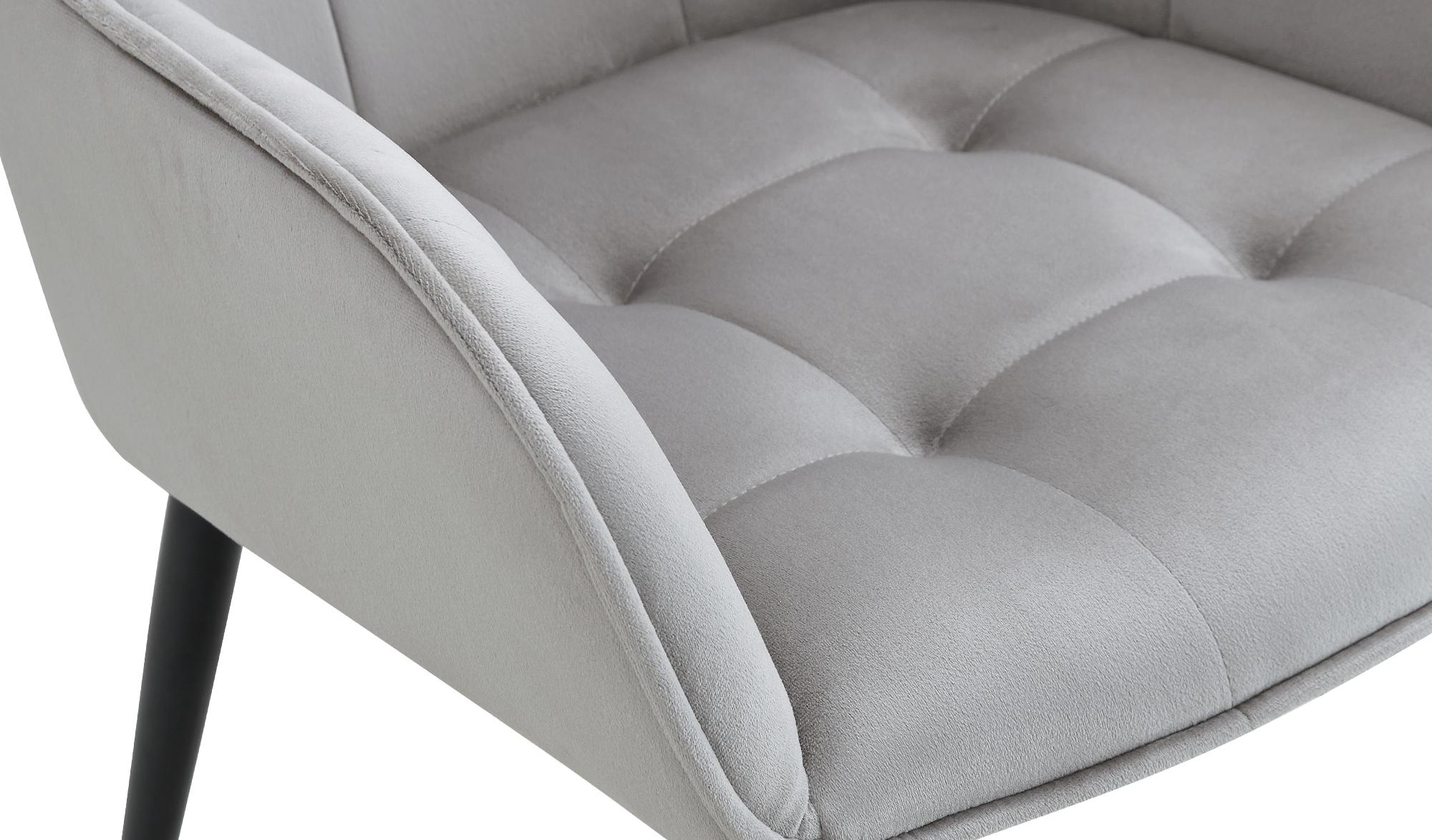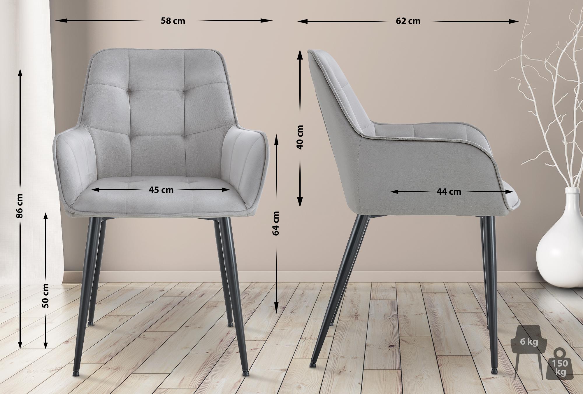 Moderní jídelní židle s pohodlným čalouněným sedátkem a područkami. Sametové čalounění a kovový rám o nosnosti 150 kg zaručují styl a odolnost. Ideální do jídelny, ložnice nebo jako židle pro čtení - ergonomický tvar pro delší sezení.