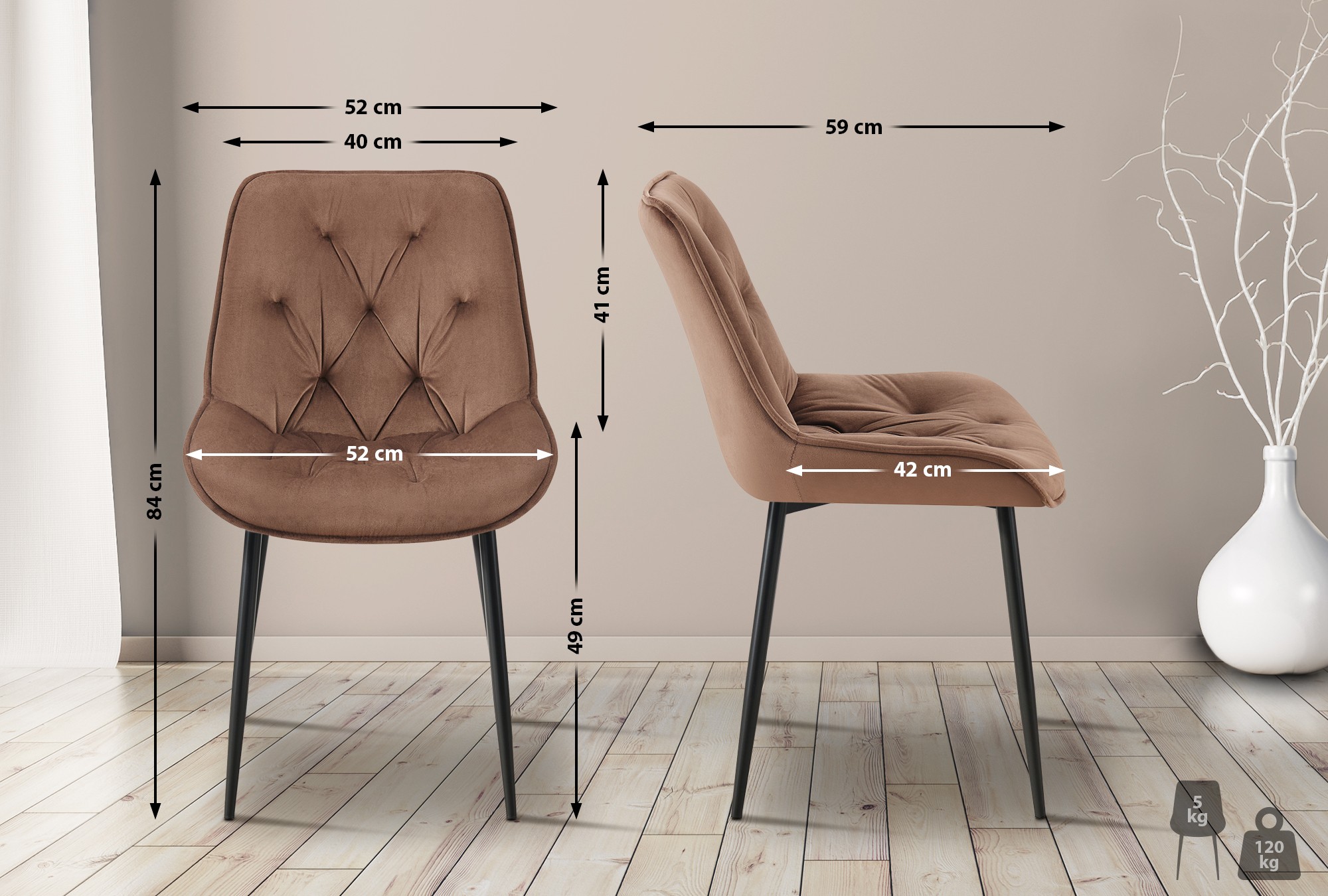 Jídelní židle Wallace nabízí vysoký komfort a moderní design. Čalouněná židle s příjemným sametovým potahem a prošívaným vzorem je vhodná do kuchyně, obývacího pokoje či jídelny. Stabilní kovový rám unese až 120 kg.