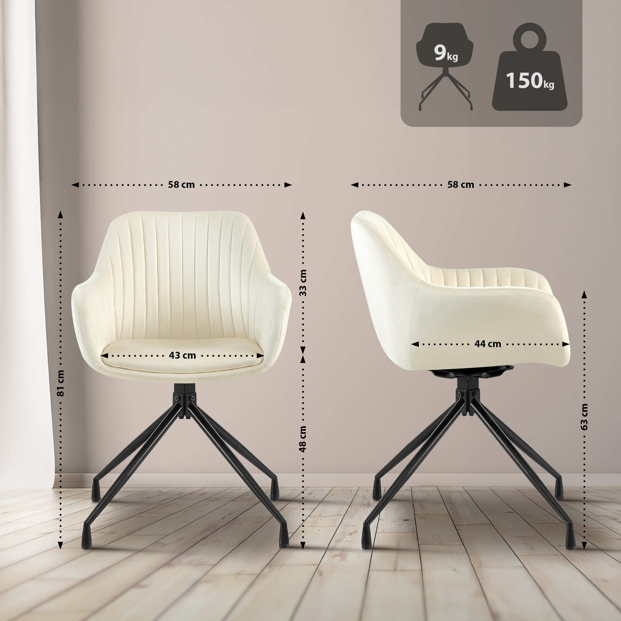 Jídelní židle Welby spojuje moderní design s maximálním pohodlím. Luxusní sametový potah, otočné sedátko a čalouněné opěrky rukou poskytují prvotřídní komfort, zatímco kovový rám zaručuje stabilitu s nosností až 150 kg.