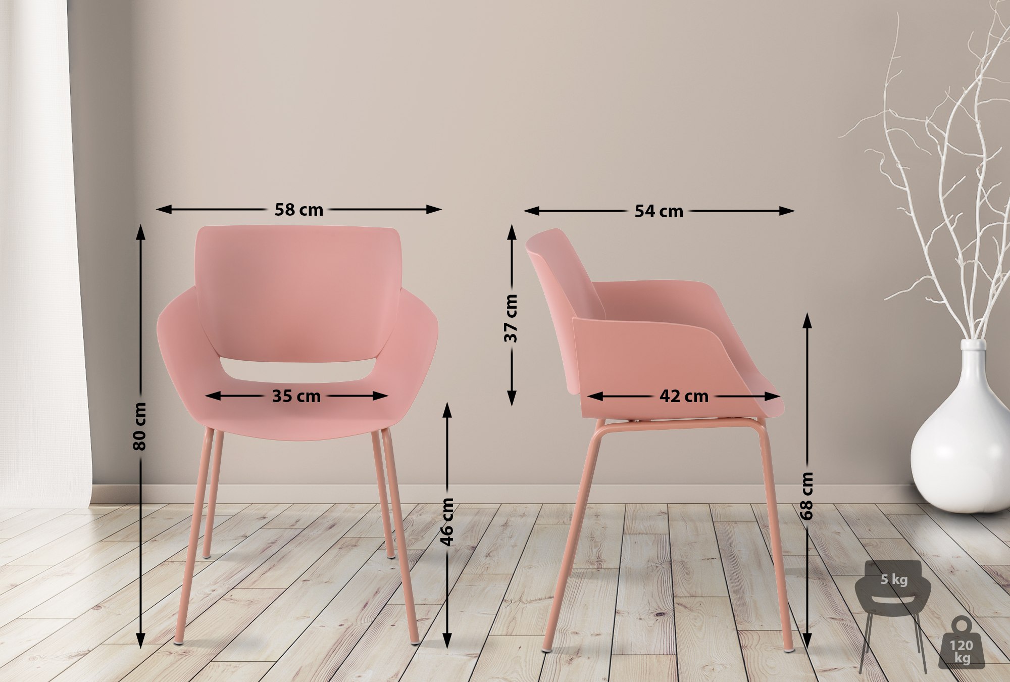 Kostra židle je vyrobena z práškově lakované oceli, díky čemuž je odolná vůči korozi a korozi. Barvy skořepiny sedáku a rámů židle jsou sladěny.