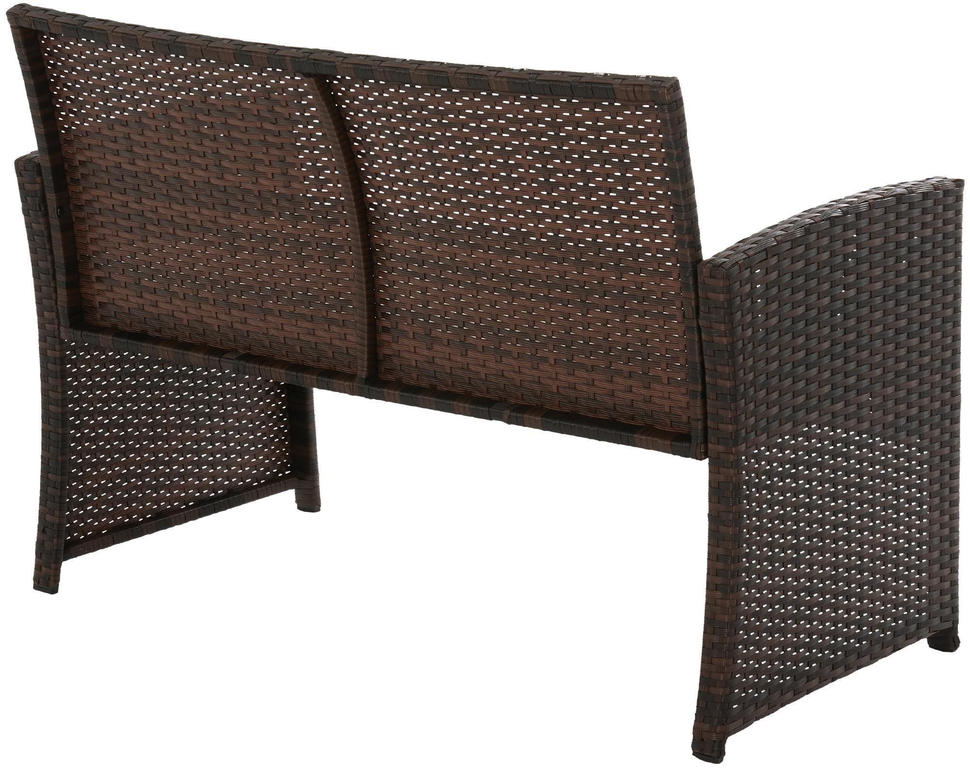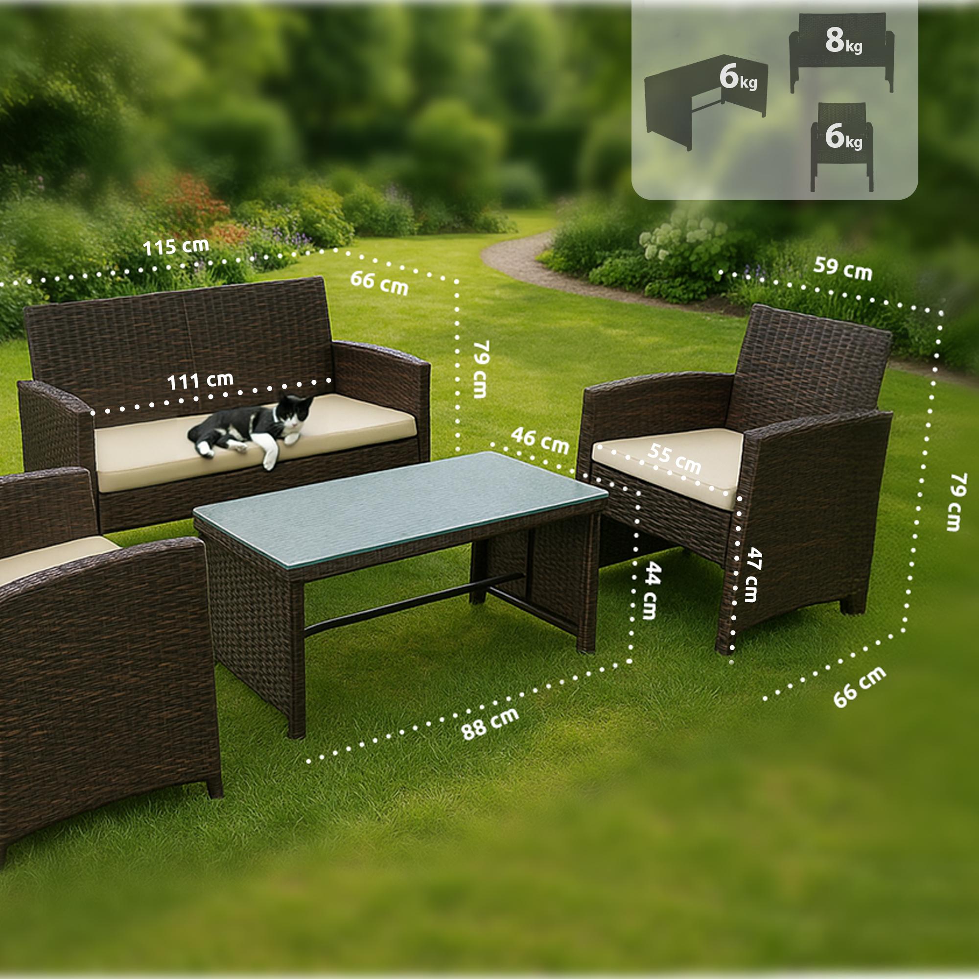 Zahradní souprava se skládá ze dvou křesel, pohovky pro dvě osoby a zahradního stolu se skleněnou deskou. Pohodlné sedací polštáře jsou součástí soupravy a zvyšují komfort sezení spolu s opěradly.
