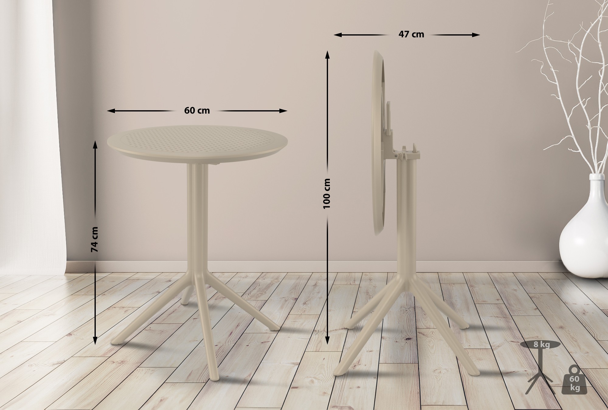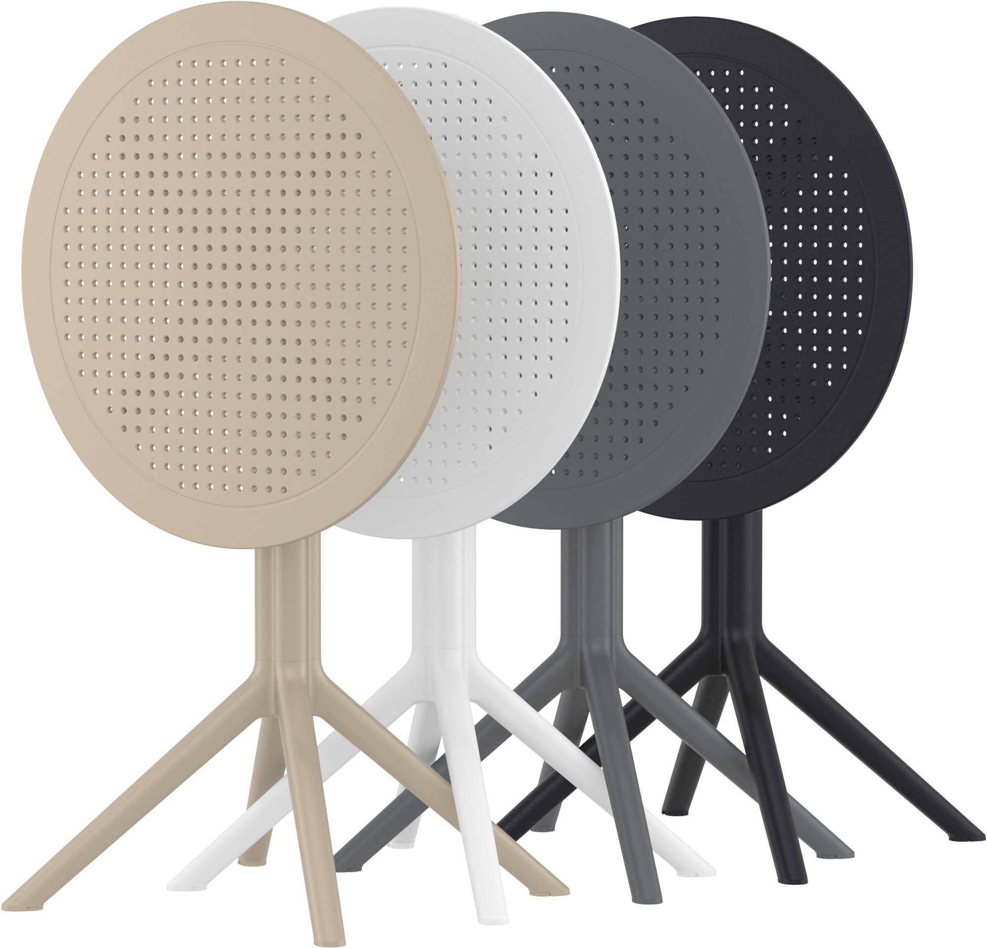 Lehký skládací stůl Sky s UV odolným povrchem pro interiér i exteriér. Vhodný jako bistro stůl nebo na terasu, s výběrem kulaté nebo čtvercové desky 60 cm. Praktický na akce díky jednoduchému skládání.