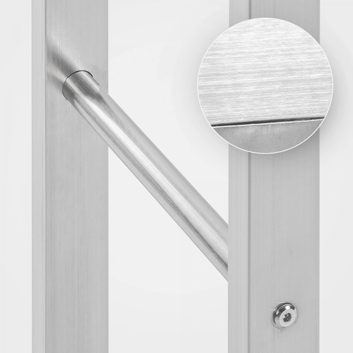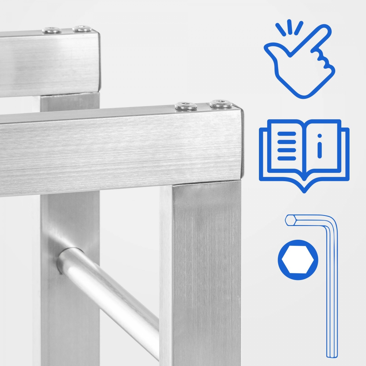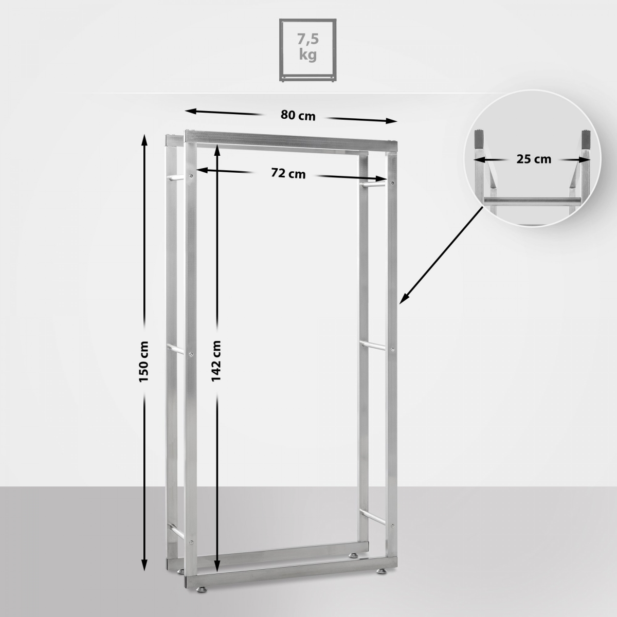 Exkluzivní stojan na palivové dříví z robustní nerezové oceli s moderním designem. Stabilní konstrukce s nožičkami pro ochranu podlahy, vhodný do interiéru. Rozměry: 150 x 80 x 25 cm, ideální pro domácnost i komerční prostory.