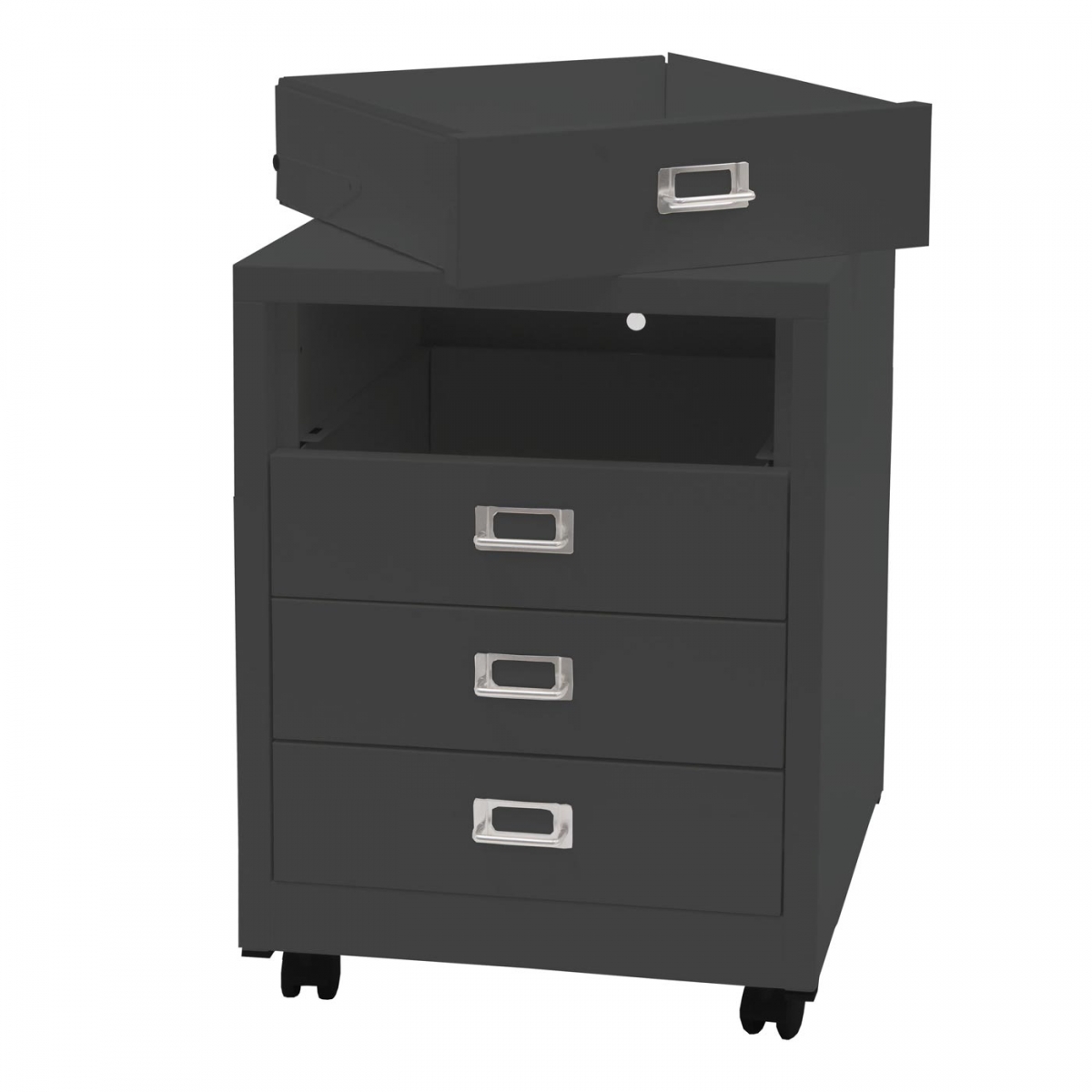 - Tento jednoduchý kancelářský kontejner nesmí. Čtyři zásuvky z oceli nabízejí dostatek místa například pro kancelářské potřeby, počítačové příslušenství a dokumenty, které nemají co hledat na vašem stole.