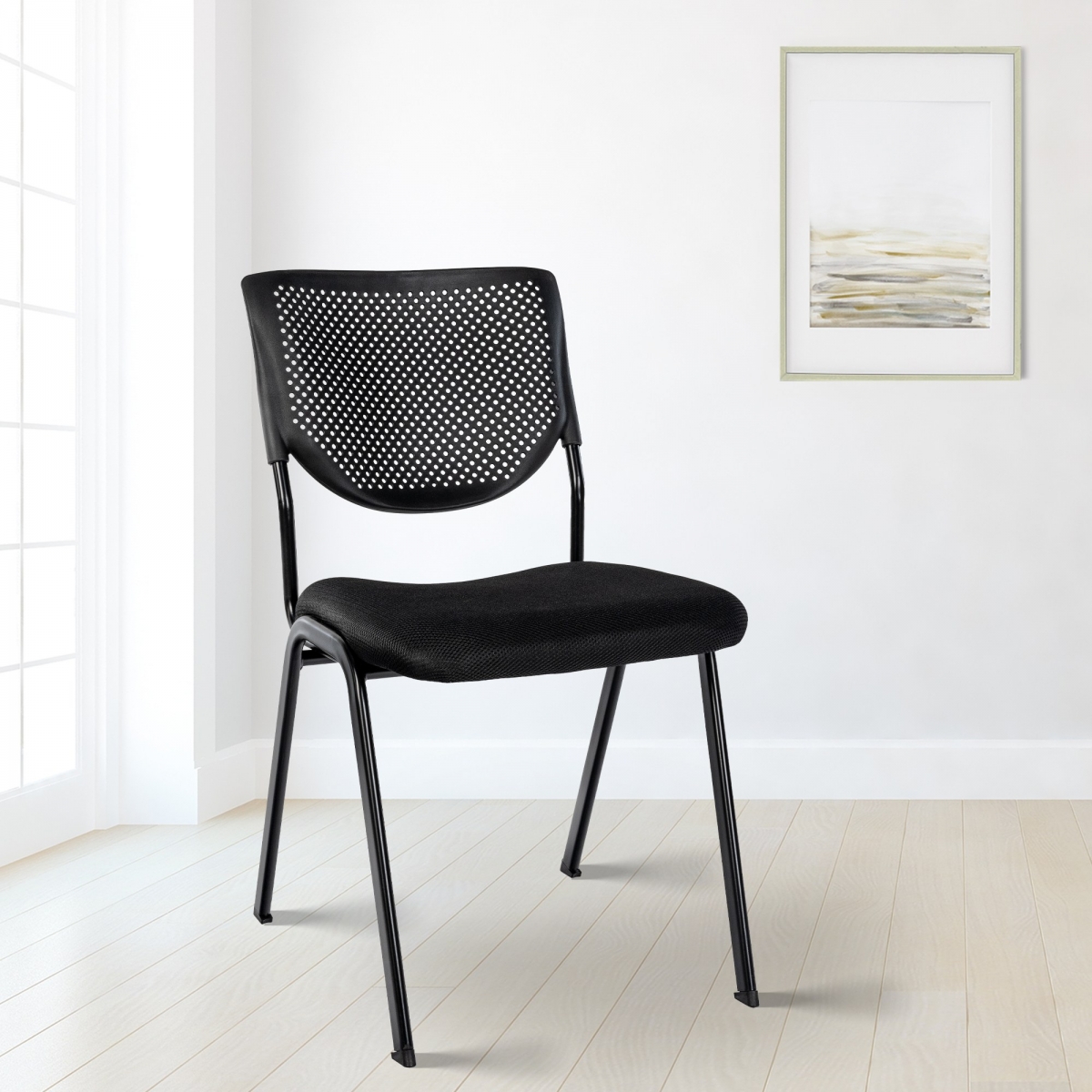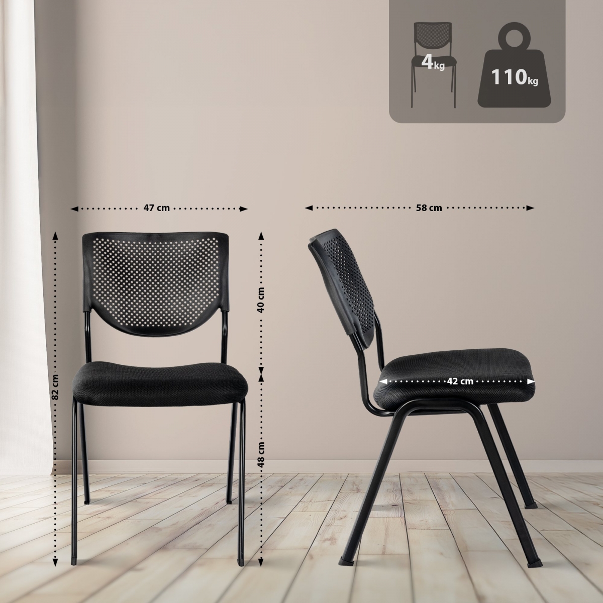 Několik židlí lze stohovat, takže je lze skladovat a používat flexibilně a prostorově úsporným způsobem. Plastové chrániče podlah zabraňují poškození citlivých podlah.
