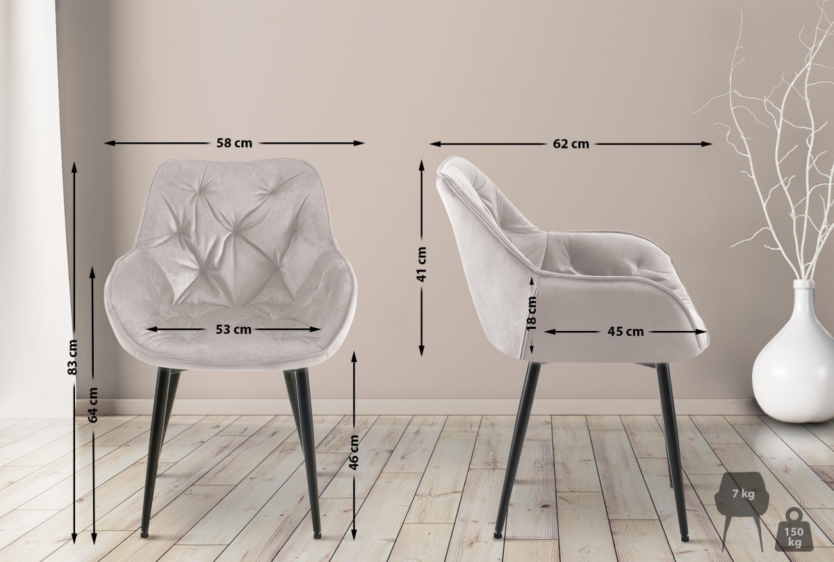 Jídelní židle Tanna velvet - elegantní kousek do moderního interiéru. Sametové čalounění, pohodlné polstrování a kovový rám zaručují komfort i styl. Ideální volba pro jídelnu nebo obývací pokoj s nosností až 150 kg.